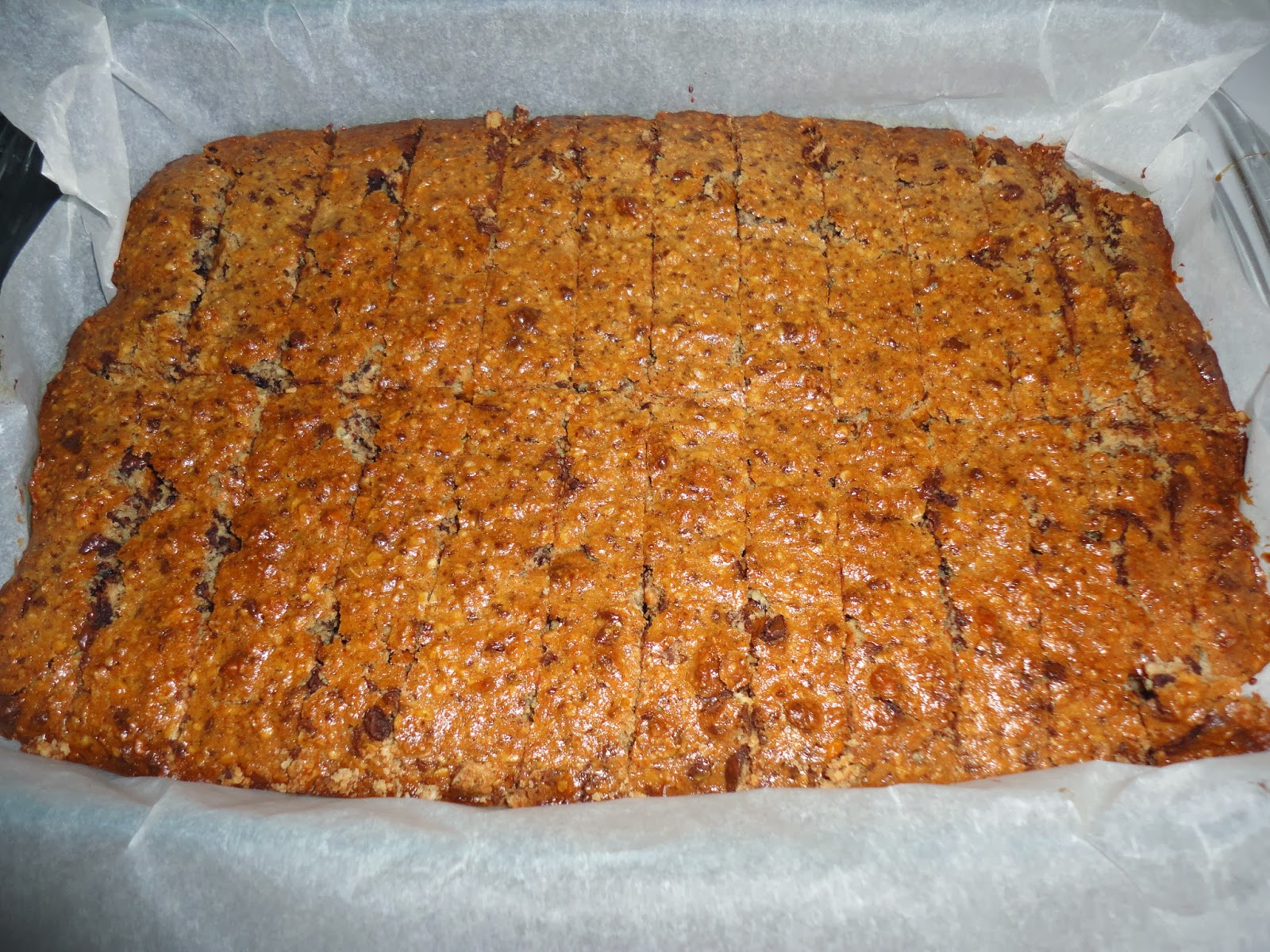 Όταν γίνει, το αφήνουμε να κρυώσει λίγο και το κόβουμε σε οριζόντιες και κάθετες λωρίδες για να σχηματίσουμε μπάρες. Δεν το αφήνουμε να κρυώσει τελείως γιατί θα σκληρύνει και δε θα κόβεται.