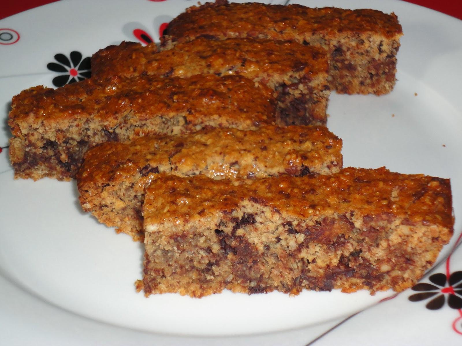 Σε ένα μπολ ρίχνουμε τη βρώμη, το ελαιόλαδο, το μέλι, το αυγό, τη ζάχαρη και ανακατεύουμε με μια πλατιά κουτάλα καλά μέχρι να ομογενοποιηθούν τα υλικά μας. Προσθέτουμε το γάλα, το αλάτι και ανακατεύουμε. Έπειτα ρίχνουμε το αλεύρι σταδιακά και ταυτόχρονα συνεχίζουμε το ανακάτεμα. Συνεχίζουμε να ανακατεύουμε και αφού το ρίξουμε όλο το αλεύρι, μέχρι η ζύμη μας να είναι κάπως σφιχτή. Προσθέτουμε τα καρύδια και τη σοκολάτα και ανακατεύουμε να απλωθούν ομοιόμορφα στο μείγμα μας.